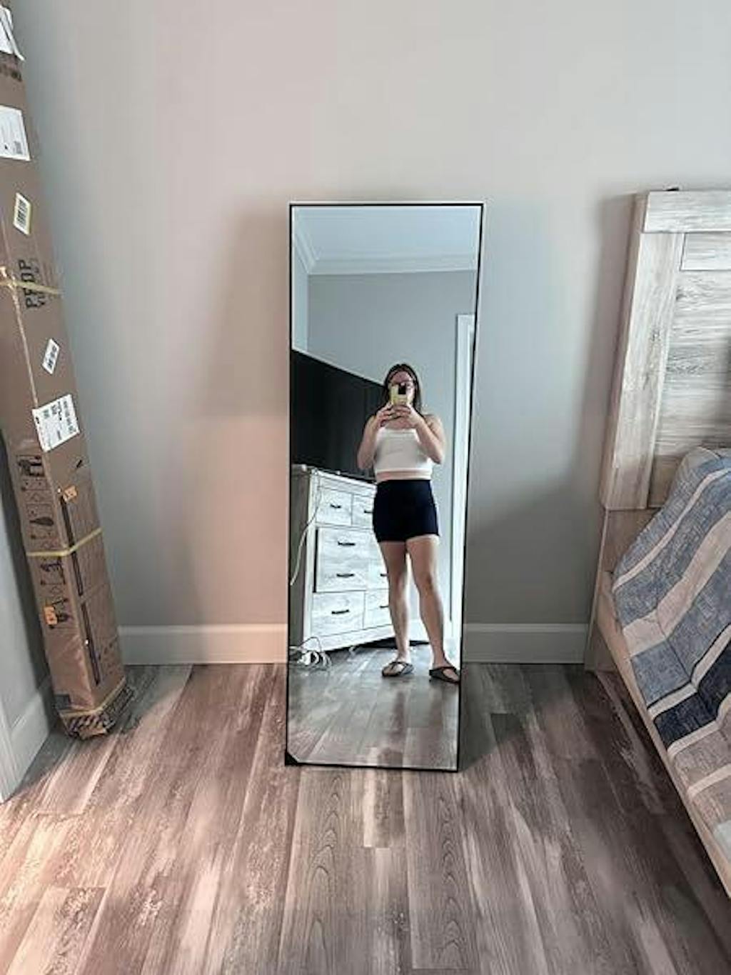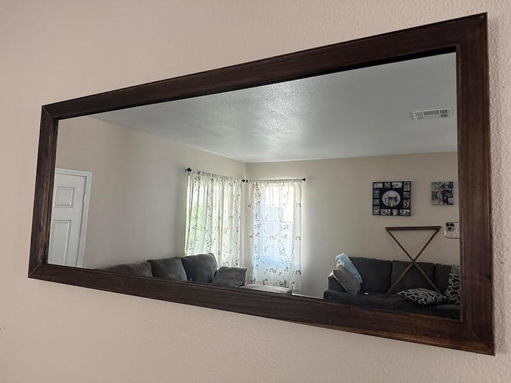 I can’t say anything bad about this Mirror. The size is perfect for decorating a space in your living room or for your bedroom. It’s great to take pictures in front of. Sturdy and comes with screws to mount it on a wall or you can kick it back on the floor. Highly recommend!!