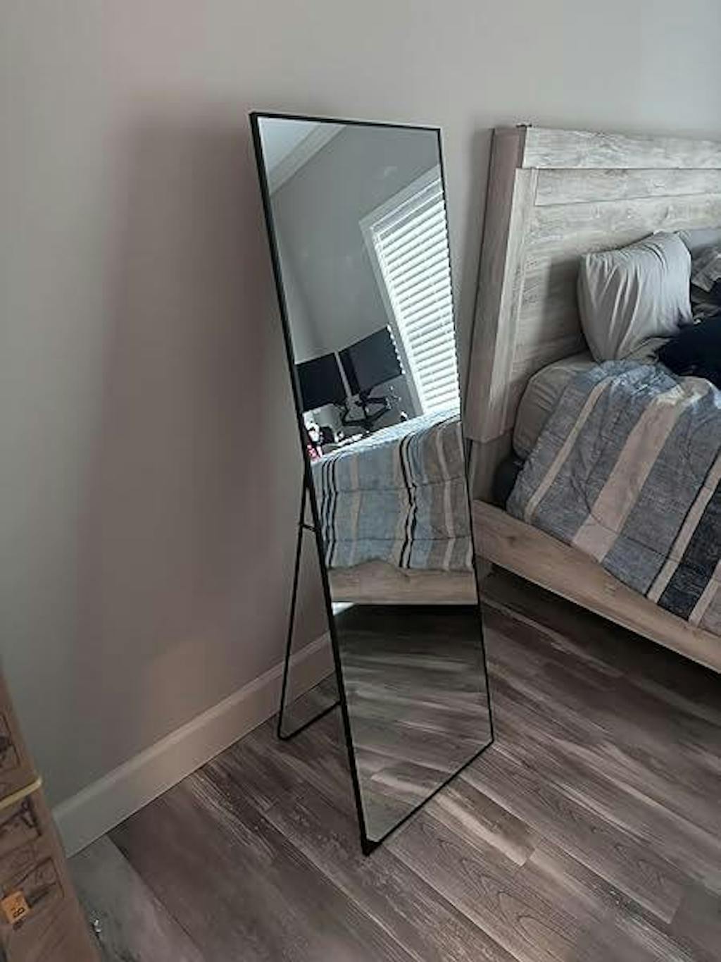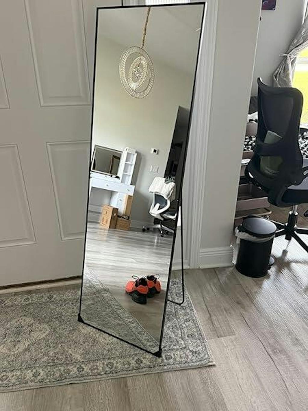 I selected this standing mirror for our bedroom. It’s a lovely piece and I like how it can be hung up on the wall or it can be free standing with the leg behind it. It’s gorgeous and it definitely upgrades the look in our bedroom. It comes with the pieces to be able to hang on the wall as well. It’s very sturdy and versatile for how you want to decorate the area you ae putting it in. I would recommend this mirror for any room.