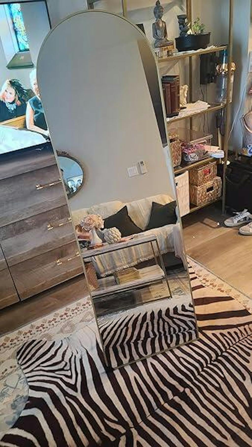 We love a good standing mirror girls. This beautiful gold trim, aesthetic arch and clear glass are IT .
